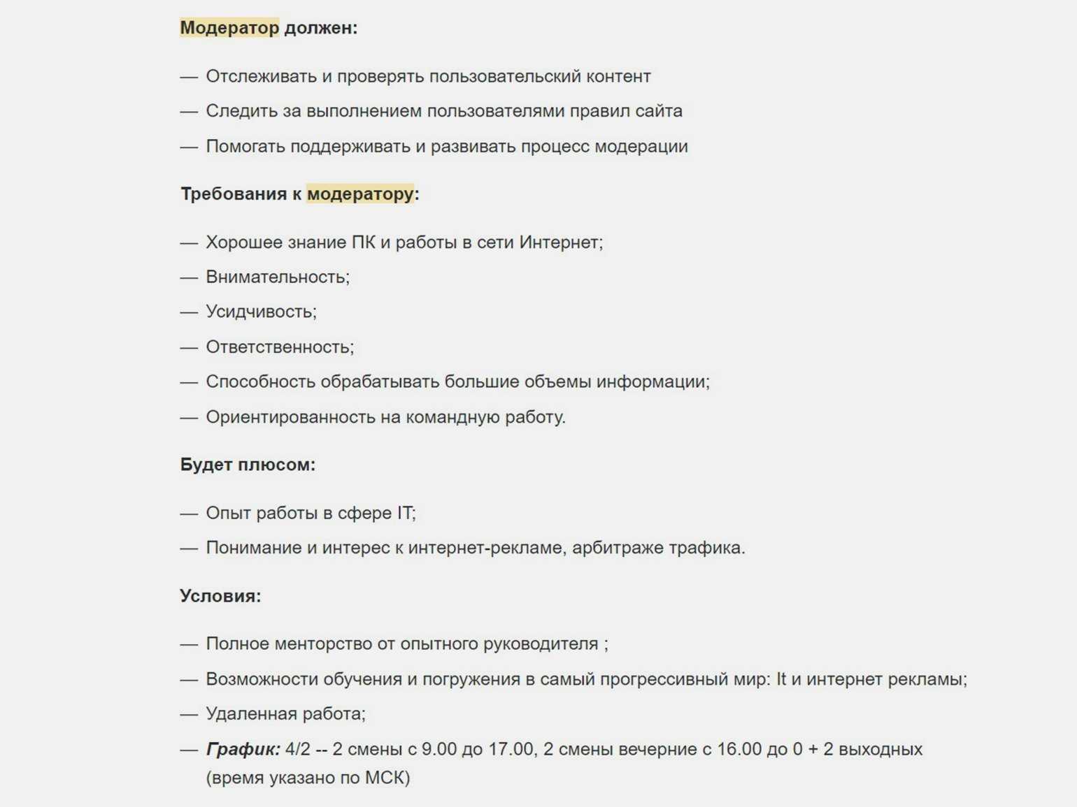 Пример требований к модераторуСкриншот: HeadHunter