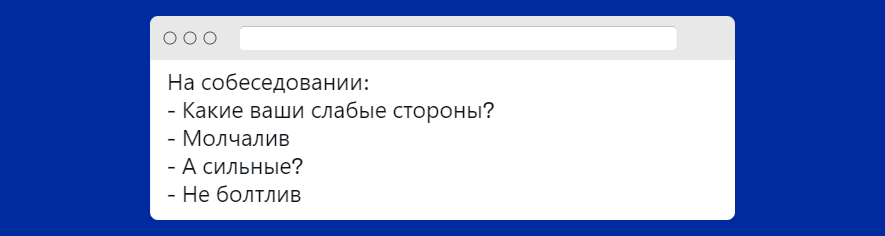 Пафосное «у меня нет недостатков» или избитое «я трудоголик» не устроит работодателя. Еще один плохой вариант — не сказать ничего. Так вы покажете, что не подготовились к собеседованию и не можете взвешенно оценить свои достоинства и недостатки.