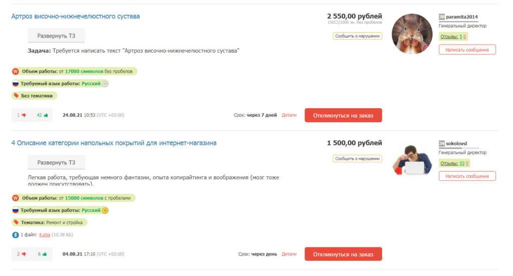 Крупная биржа для копирайтеров, рерайтеров, переводчиков. В ней много заказов с довольно хорошей оплатой. Но и исполнителей здесь немало. Чтобы получить заказ, нужно или демпинговать, или обладать уникальными навыками.
