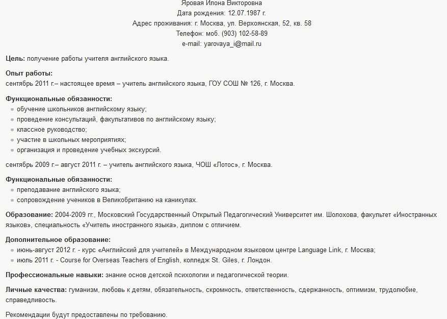 В отличие от опытных специалистов, начинающие вполне могут включить в образец резюме студента и среднюю школу. Например, законченное образовательное учреждение с углубленным изучением иностранных языков является большим плюсом для многих профессий.