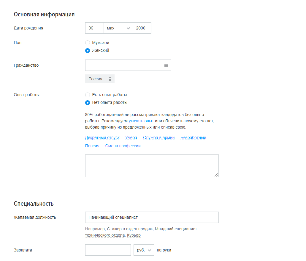 Резюме без опыта и без объяснения причин, по которым он отсутствует, не пройдет модерацию на hh.ru. Дело в том, что резюме без опыта не представляют интереса для 80% работодателей, а неясность причин, по которым опыта нет, вызывает подозрения в том, что соискатель что-то скрывает либо резюме фейковое.