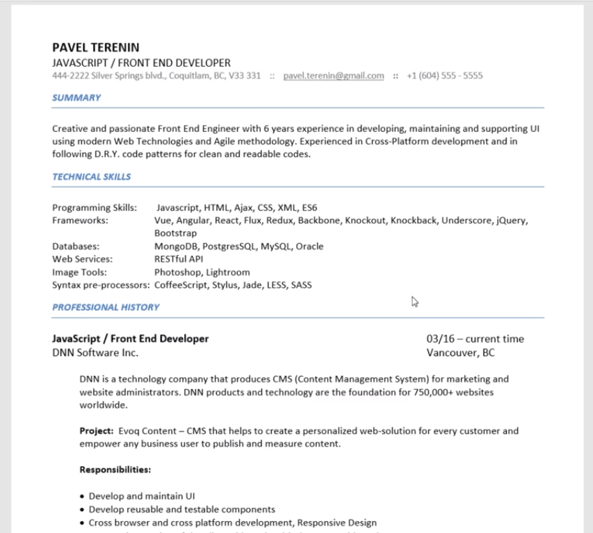 При формировании резюме также стоит руководствоваться принципом: краткость – сестра таланта. Размер документа не должен превышать 2 страниц. Постарайтесь описывать опыт работы по сути. Если для украинских работодателей приемлема более развернутая форма описания возможностей кандидата, то для канадцев очень важны структурированность и лаконичность.