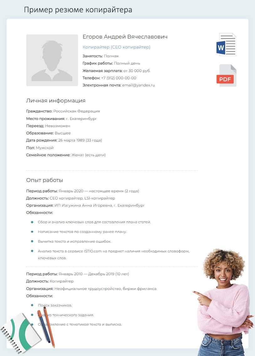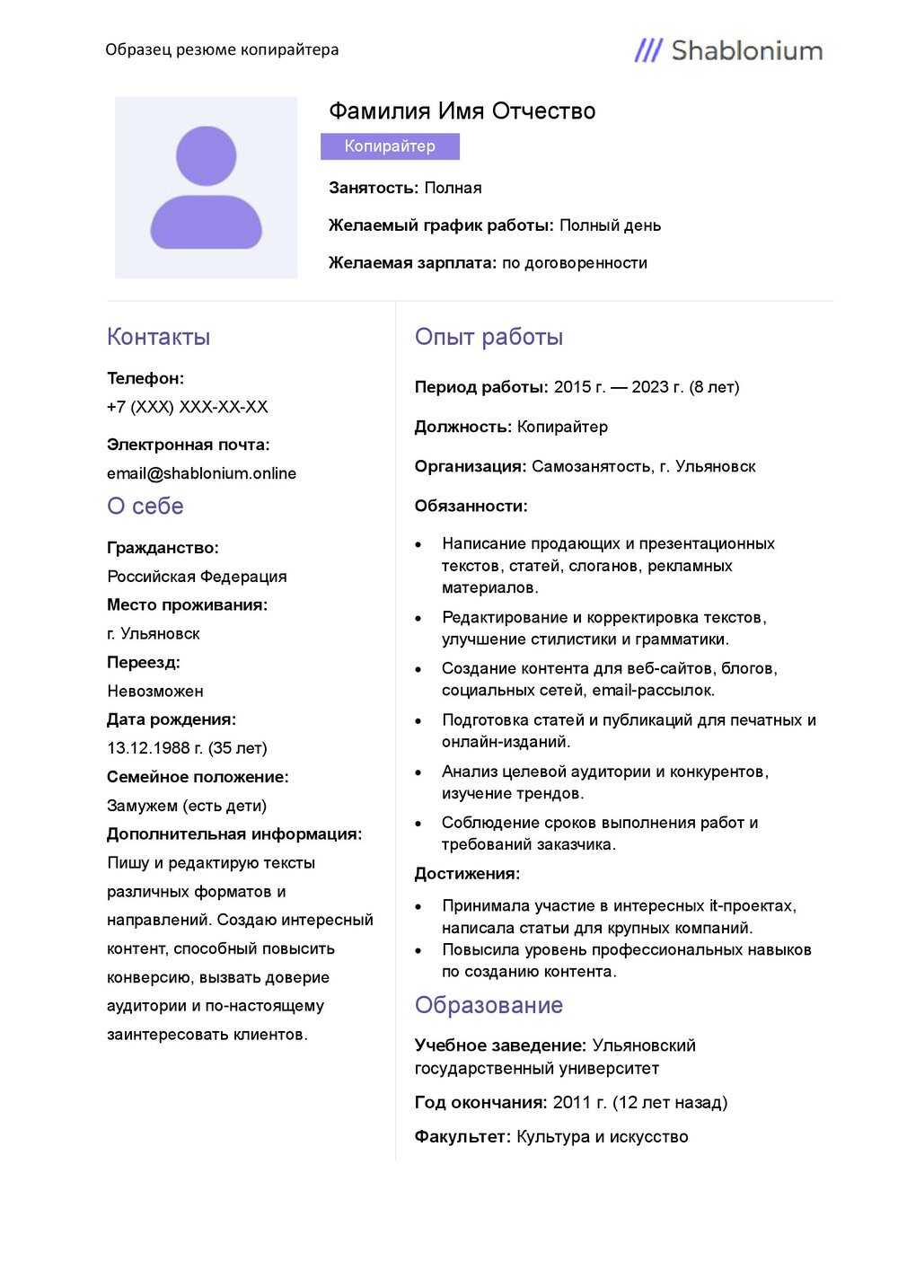 Используйте структурированный образец резюме копирайтера для устройства на работу в 2024 году. Заполненный бланк резюме представлен в профессиональном формате, который поможет подчеркнуть ваш опыт, образование, навыки и достижения.