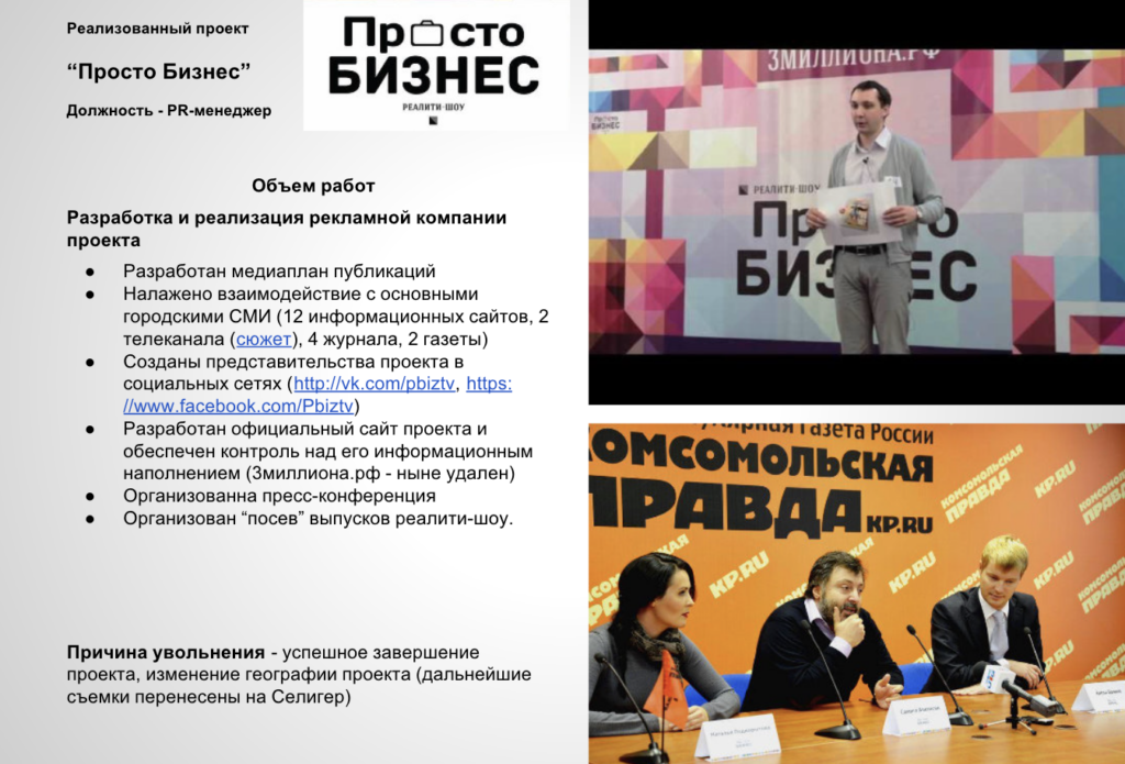 Более того, часто люди могут не знать, зачем вообще нужны публикации в СМИ, выступления на конференциях, бизнес-завтраки или встречи с журналистами. То есть — звучит хорошо, но не совсем понятно, как это поможет бизнесу. Как в примере ниже, неизвестно, какие цели ставила компания перед PR-менеджером и как он их достиг.