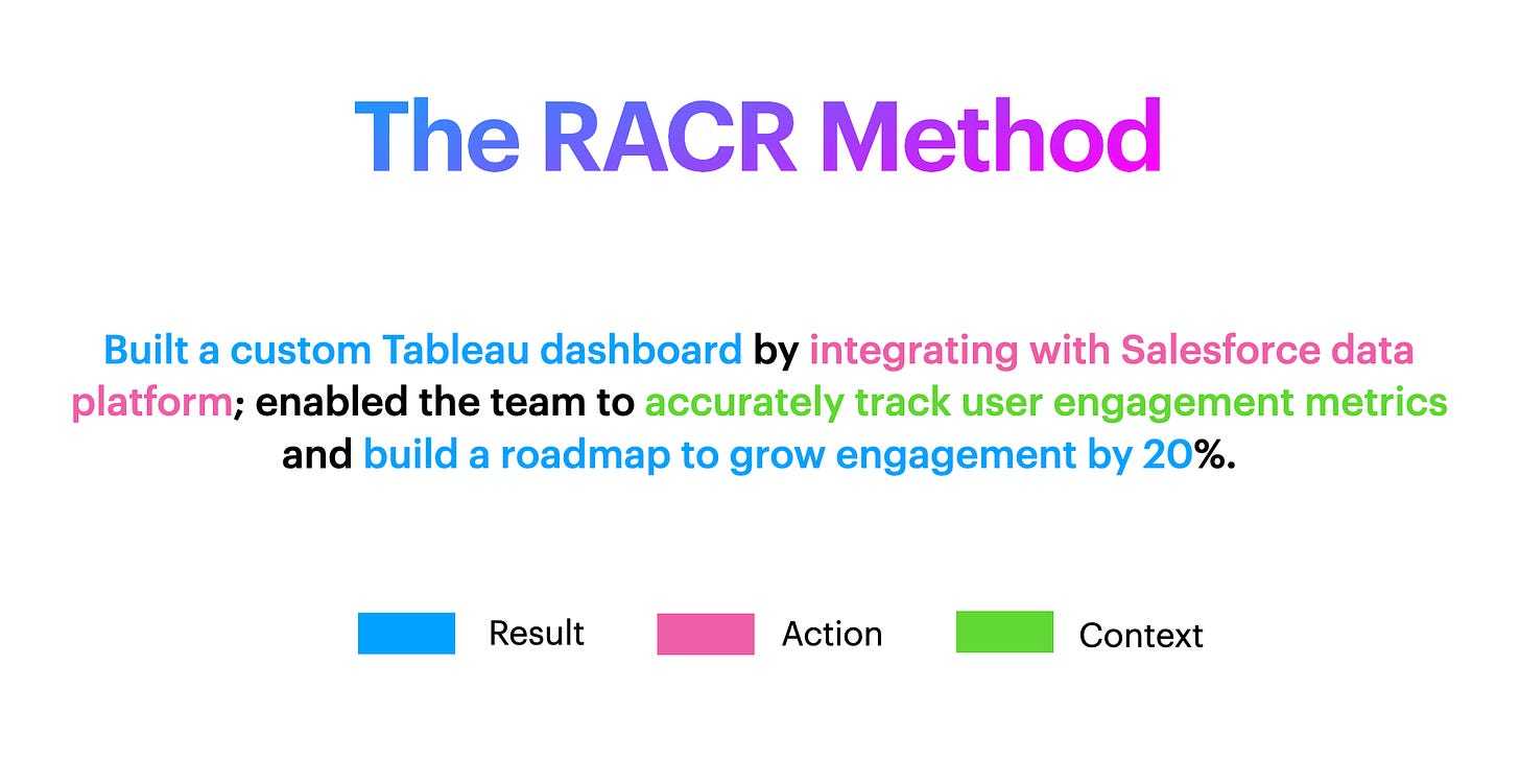This is why I recommend RACR, or result, action, context and result. Yes, the result is twice on purpose. This is because there are often two levels of results: the outcome of your action and the impact of this outcome. Here’s an example using a strong PM bullet point.