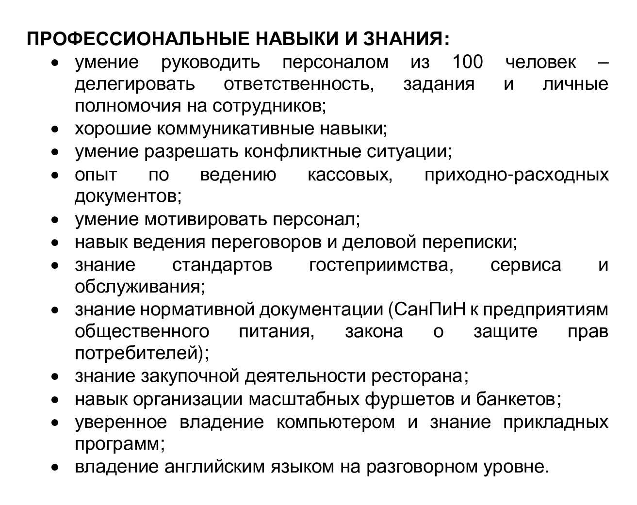 - требуемые навыки, знания (например, менеджмент, логистика, основы бизнес-планирования, делопроизводства; правила эксплуатация оборудования, электроприборов, правила сервировки и оформления барных стоек и интерьера и др.);