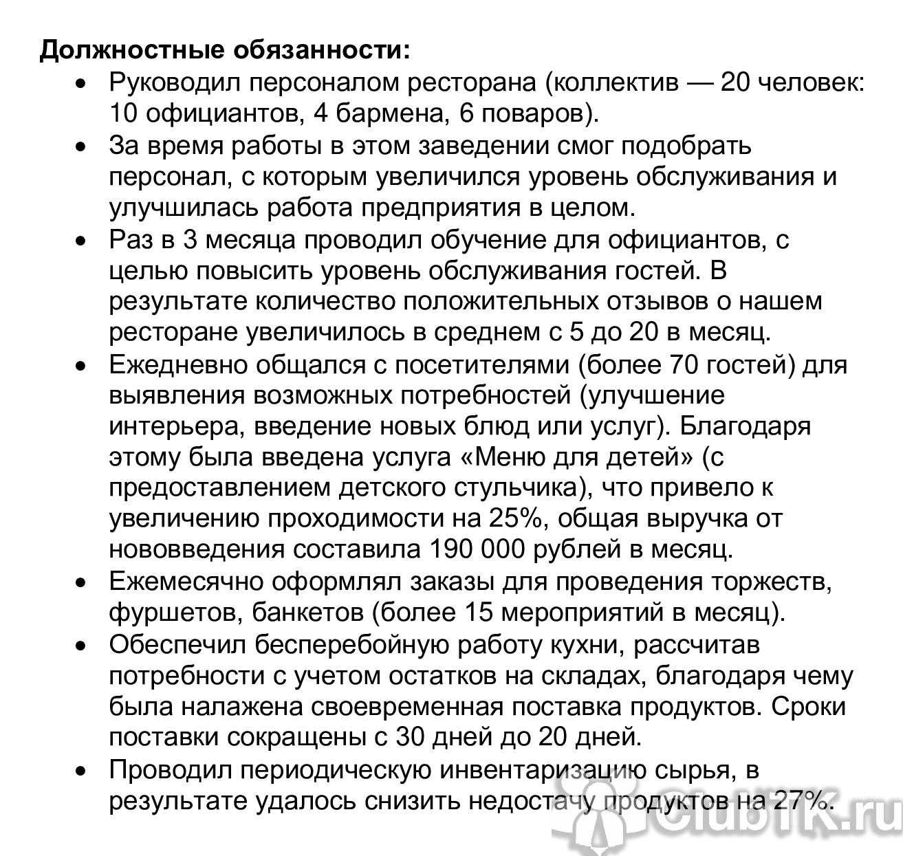 Другой способ описать выполняемые обязанности в резюме — перечислить функции с указанием конкретных цифр и достижений. Вот как выглядит пример обязанностей администратора ресторана для резюме в свободном стиле: