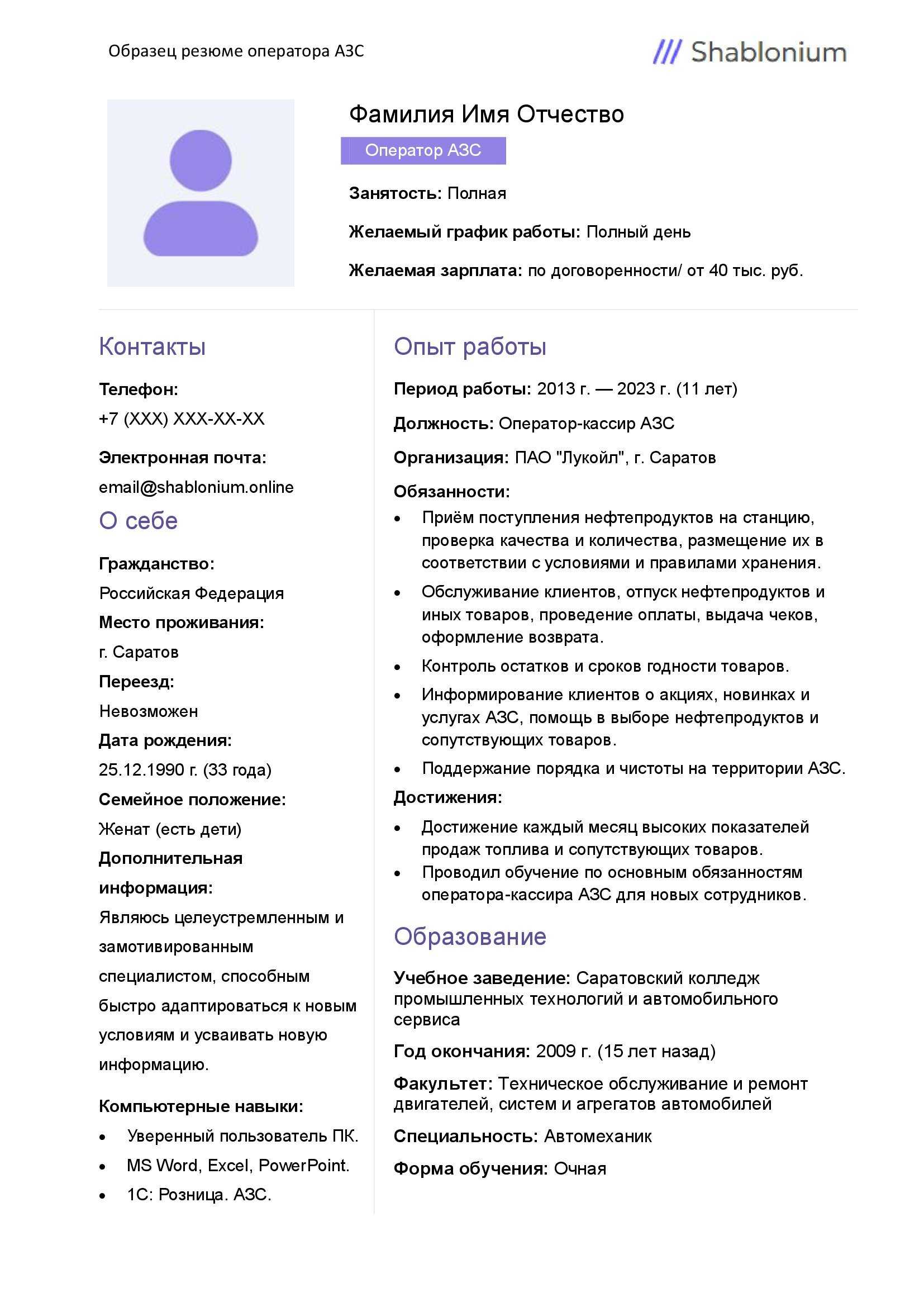 Образец резюме оператора АЗС должен выглядеть следующим образом: