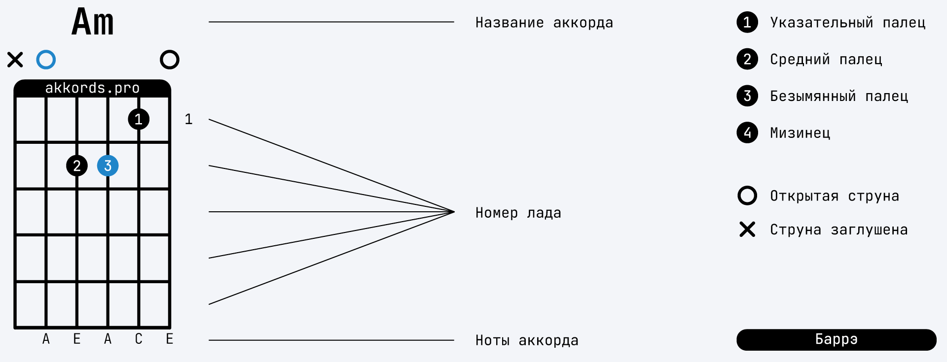 Внимательно изучите изображение ниже. Вы будете постоянно сталкиваться с такими схемами в различной литературе и на гитарных сайтах. Вертикальные линии на схеме обозначают струны, слева — 6 струна, справа — 1. Горизонтальными линиями обозначены лады. Кружками указано на каком ладу нужно зажимать струны. Синим цветом обозначается тоника аккорда (основная нота).