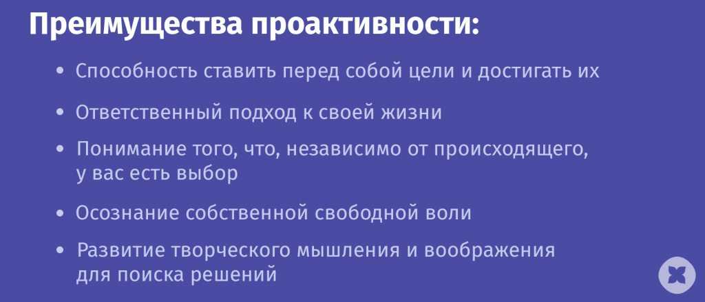 В книге Стивена Ковина «Семь навыков неэффективных людей» хорошо раскрыты преимущества проактивной жизненной позиции. Такой способ мышления позволяет: