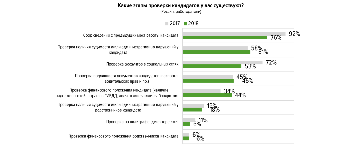 Для компаний с численностью более 500 человек чаще других характерны такие этапы, как проверка судимости кандидата (89%), подлинности его документов (68%) и проверка финансового положения (71%). Они чуть чаще других используют полиграф — в 11% случаев.