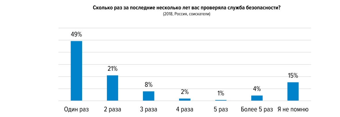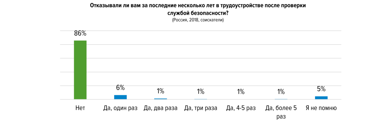 Только 10% кандидатов отмечают, что им отказывали в трудоустройстве хотя бы один раз за последние несколько лет после проверки службой безопасности. Но в основном не более одного раза.