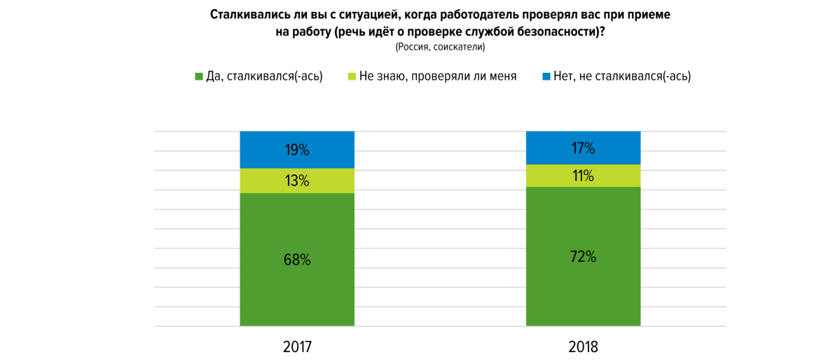 Двое соискателей из трех проходили проверку службой безопасности. В некоторых сферах это обязательная часть трудоустройства, и кандидаты относятся к ней совершенно спокойно. В первую очередь это специалисты сферы безопасности, добычи сырья и работники банков: больше 90% из них проходили такую проверку при трудоустройстве.