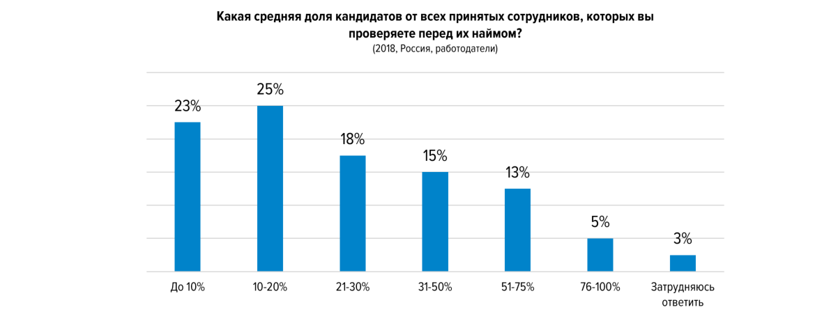 Каждый второй представитель компании отметил, что проверяет кандидатов перед тем, как оформить их на работу. Но в службу безопасности попадают не все сотрудники: в большинстве случаев проверяют не больше 30% входящих кандидатов.