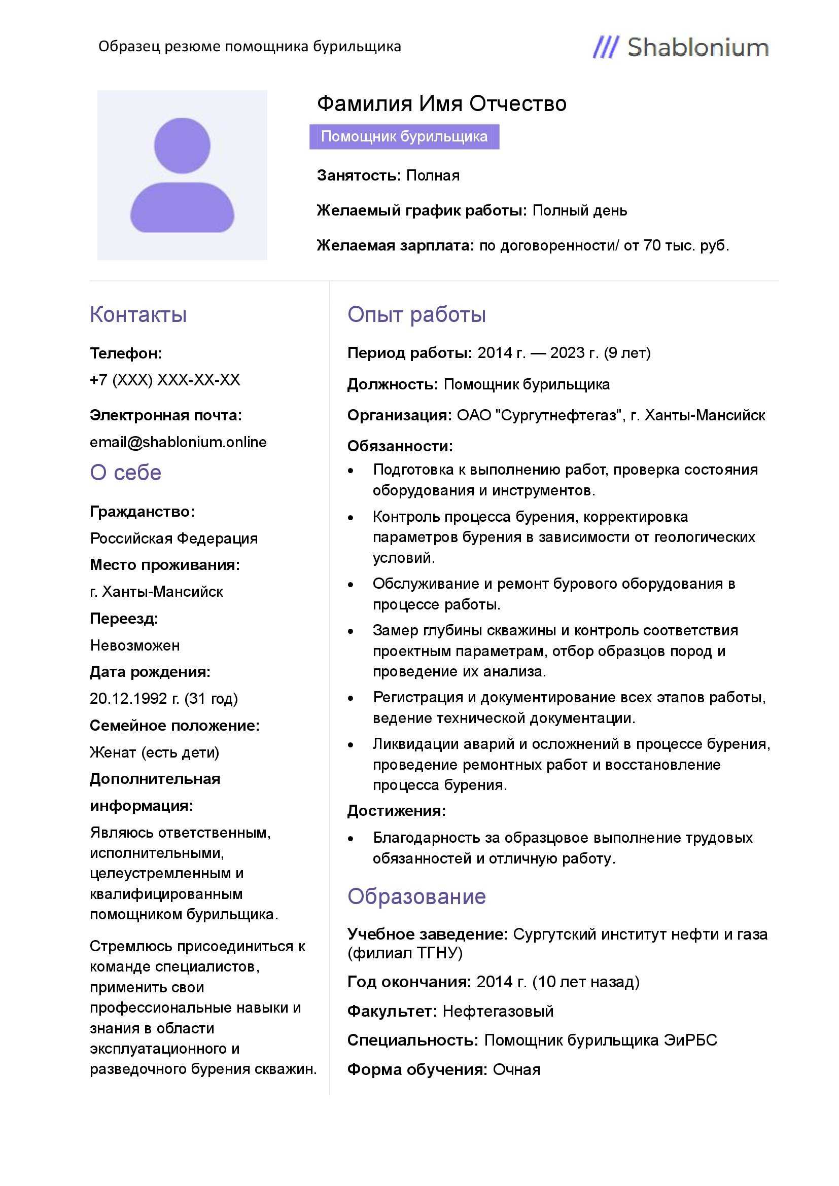 Используйте структурированный образец резюме помощника бурильщика для устройства на работу в 2024 году. Заполненный бланк резюме представлен в профессиональном формате, который поможет подчеркнуть ваш опыт, образование, навыки и достижения.