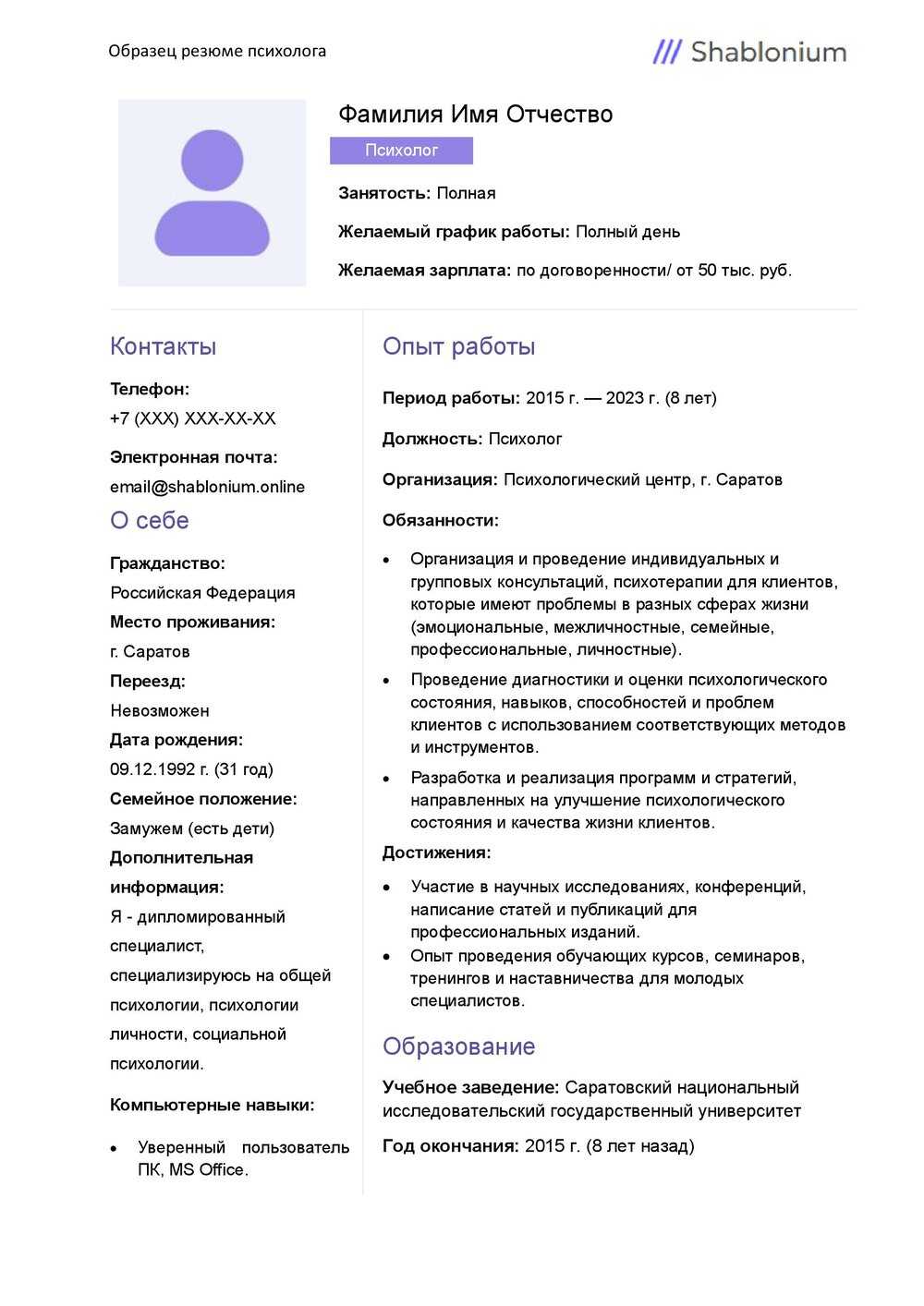 Используйте структурированный образец резюме психолога для устройства на работу в 2024 году. Заполненный бланк резюме представлен в профессиональном формате, который поможет подчеркнуть ваш опыт, образование, навыки и достижения.