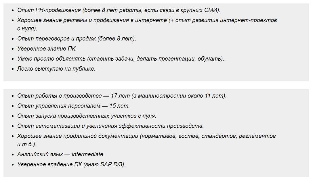 Профессиональные навыки. Коротко перечисляются ваши основные навыки, опыт работы, знания и умения, которые смогут охарактеризовать вас как профессионала.