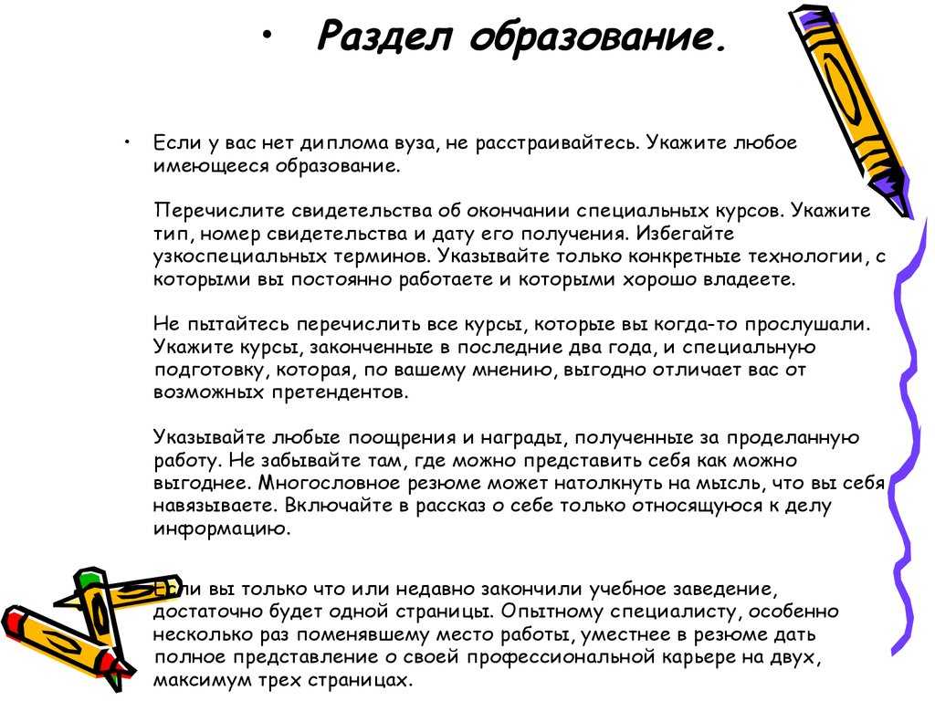 Соискателям творческих профессий можно также добавить дополнительный креативный блок, информация из которого поможет раскрыть талант кандидата.