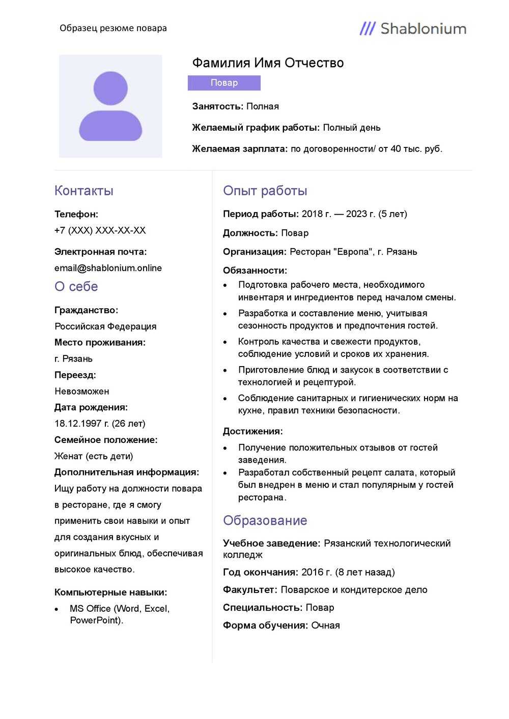 Нижеприведенный образец резюме повара поможет Вам составить собственное резюме, которое следует лишь заполнить своими данными и затем можно смело отправлять потенциальному работодателю вместе с сопроводительным письмом.