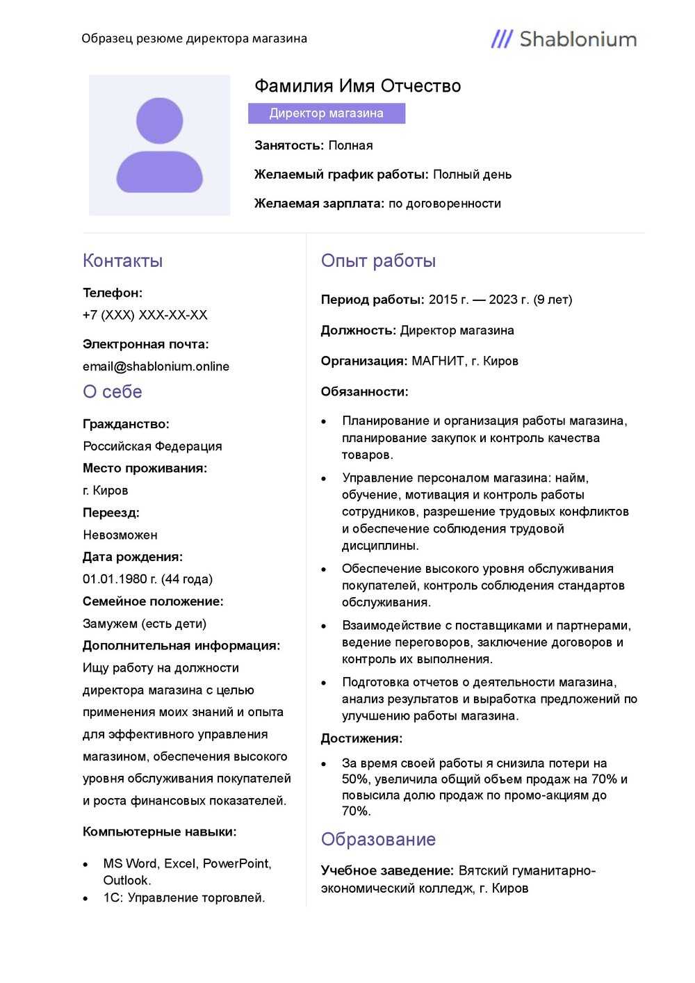 резюме на должность директора магазина образец