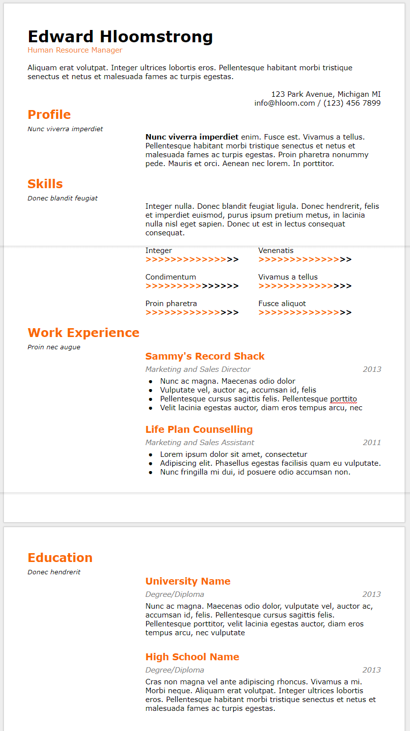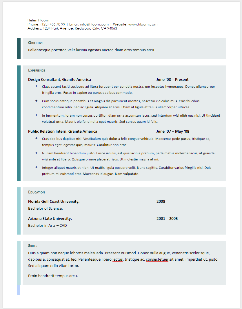 Следующие два раздела предназначены для опыта и образования, что позволяет сделать резюме коротким и понятным на одной странице. Вы можете видеть, что в этом шаблоне есть немного цвета, как и в хронологическом варианте. Он не перегружен и обеспечивает привлекательный внешний вид