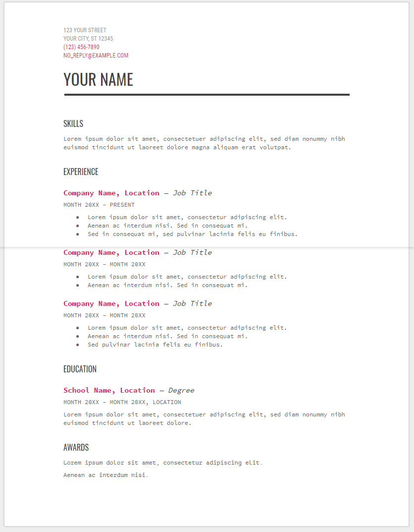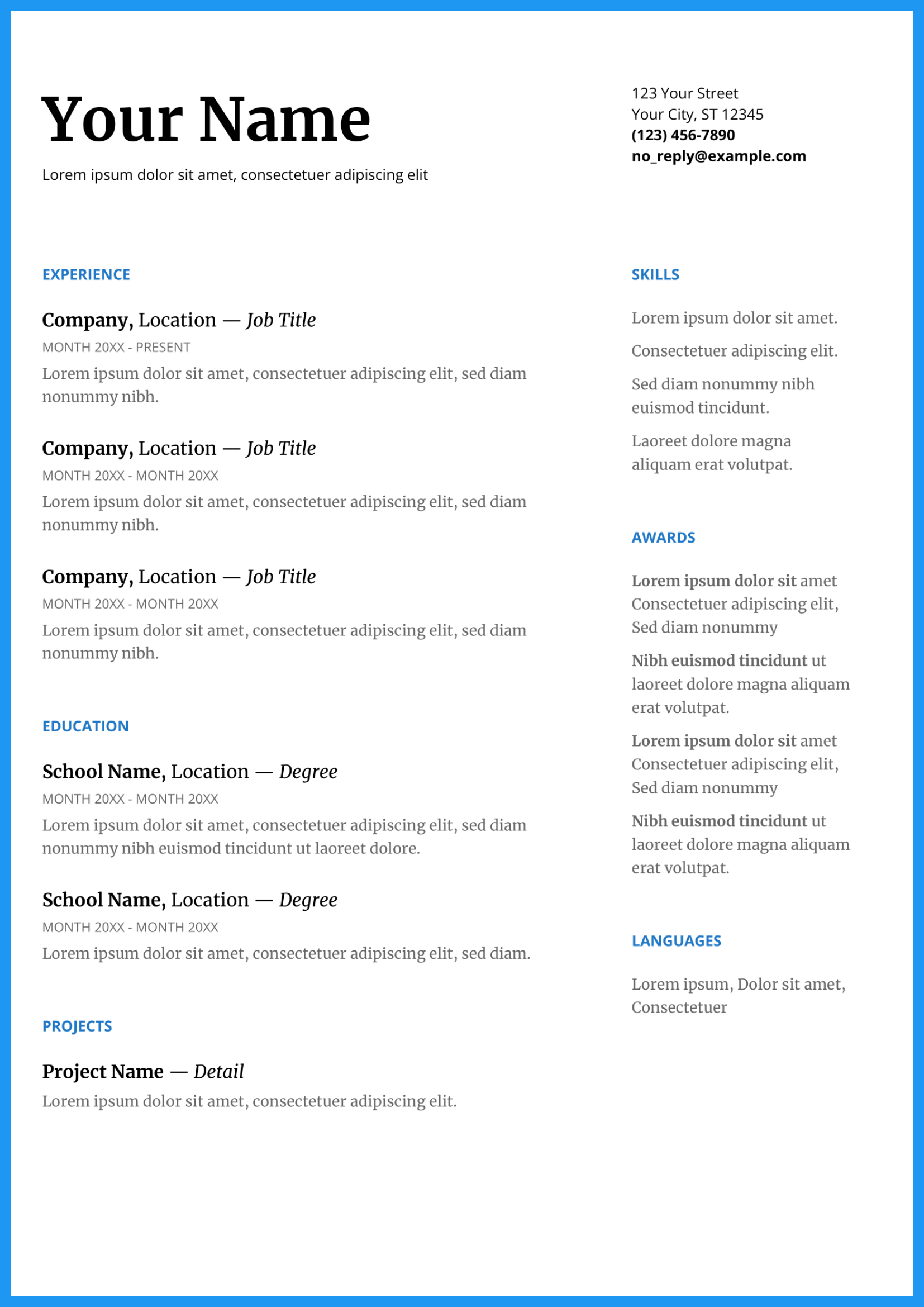 This resume template from Google follows more of a combination format, allowing you to play up the parts of your experience and expertise that most relate to the job you seek. It breaks out the skills section and separates each skill, which makes it more likely that a recruiter will be able to take note of all your attributes at a glance.