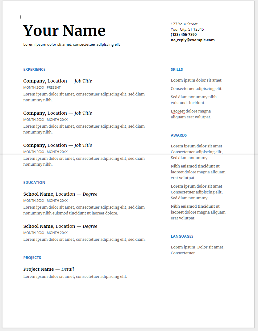 However, the free template options within Google Docs are limited, so it can be difficult to create a truly unique resume unless you significantly customize your resume. Also, the program is technically a word processor that isn’t strictly designed for the purpose of resume creation. One other limiting factor is that you can only create columns of equal width, so you would not be able to make a resume that has one narrow column and one wide column, unless you use one of the pre-made templates.
