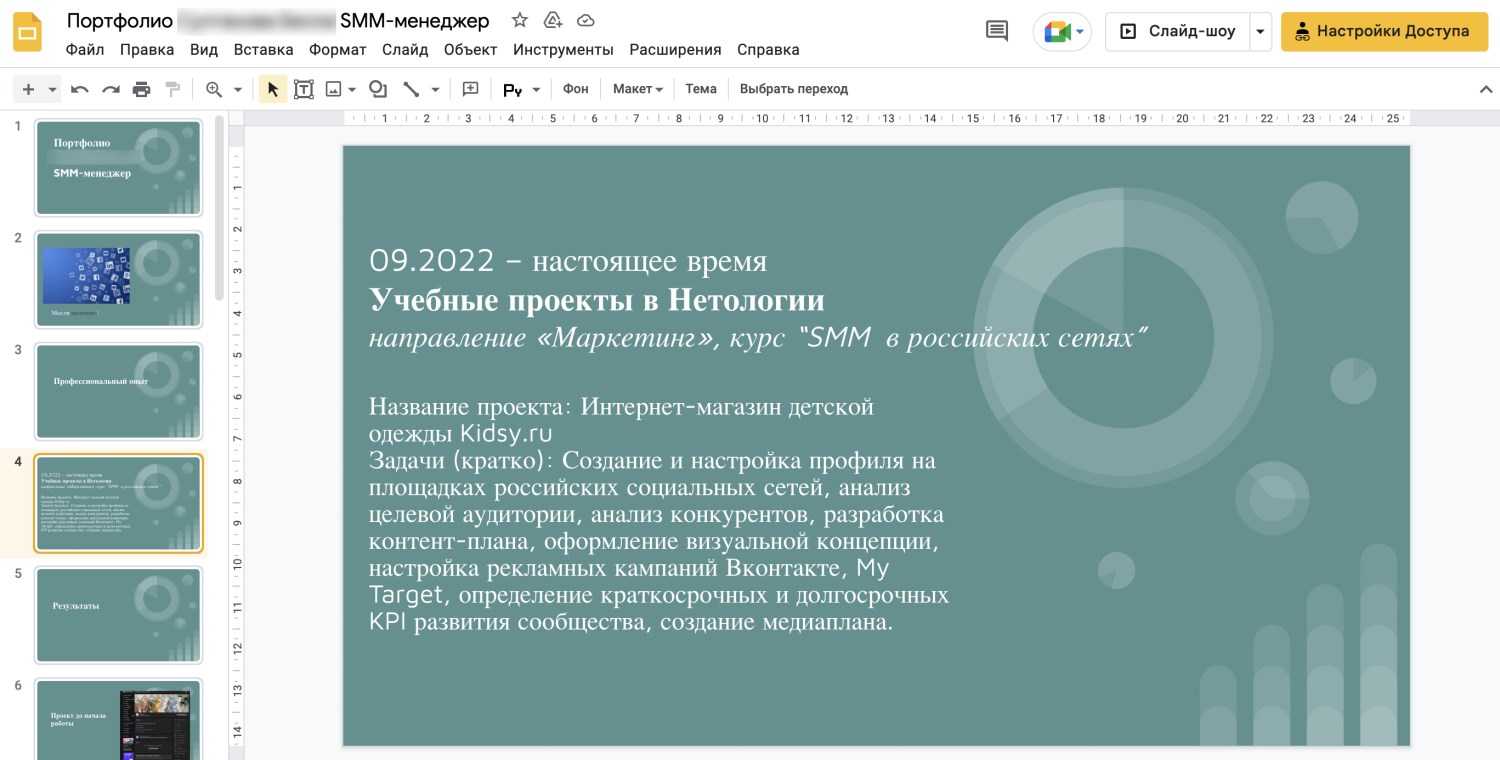 Выпускница курса по SMM оформила своё портфолио в Google Slides и включила в него учебный проект