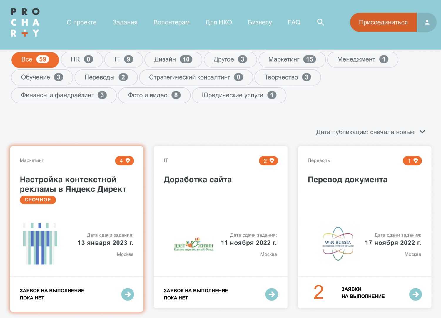 На платформе ProCharity размещены задания по разным направлениям. В карточках обозначены условия работы: что нужно сделать, к какому сроку и сколько бонусных баллов за выполненную задачу можно получить