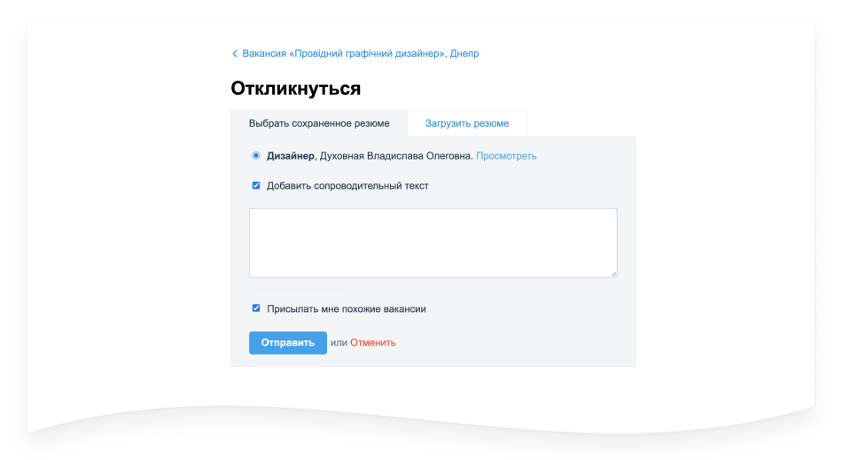 - Если же откликаетесь на вакансию на Work.ua, то нужно поставить галочку возле «Добавить сопроводительный текст».