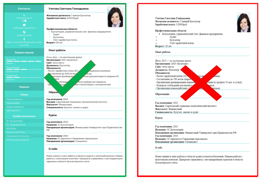 опрятный, приятный глазу деловой шрифт; определенный размер и качество фотографии; тщательно отформатированный текст, внедренный в структуру страницы так, чтобы оптимально воспринимался даже при беглом прочтении; самое важное выделено цветом или более жирным шрифтом; резюме инфографично и чем-то напоминает мини-презентацию. Самостоятельно соблюсти все эти условия и структурировать свое резюме согласно правилам 2024 года не получится, но наш сервис GetResume.ru содержит достаточное количество стильных современных шаблонов, которыми вы можете воспользоваться